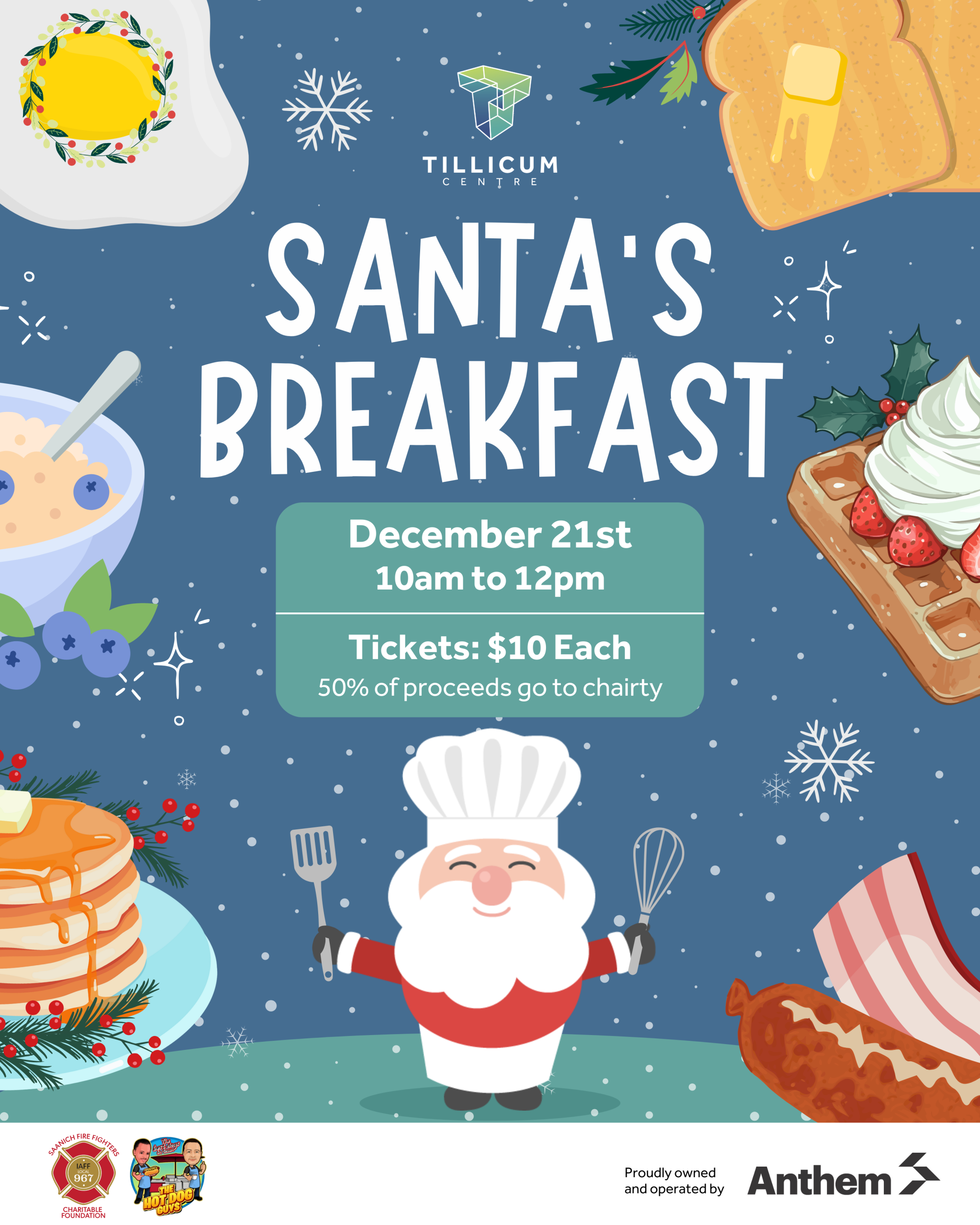 - One Santa’s Breakfast ticket includes = 1x breakfast sandwich, 1 hr. to spend with Santa per time slot and unlimited coffee for parents.
